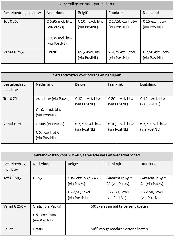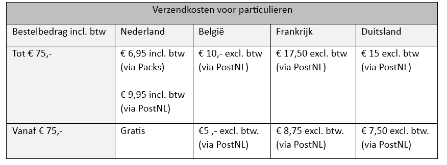 De verzendkosten zijn afhankelijk van het gewicht en de omvang van je bestelling. In de winkelwagen wordt aangegeven wat de verzendkosten zullen zijn.